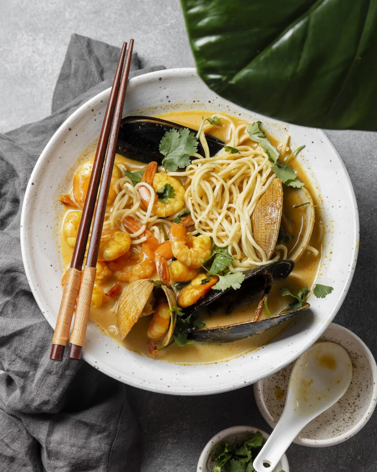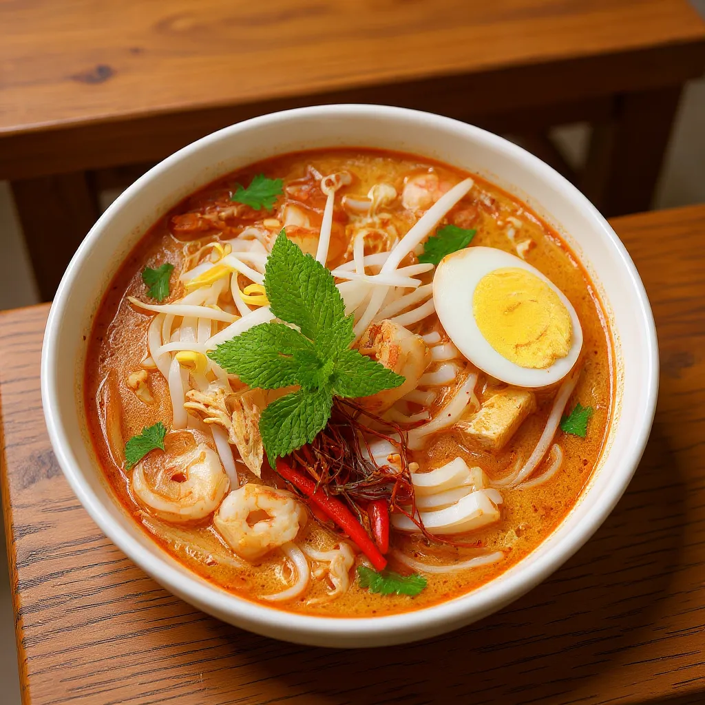 Curried noodle soup enjoy with choice of protein, egg noodle, pickled mustard green