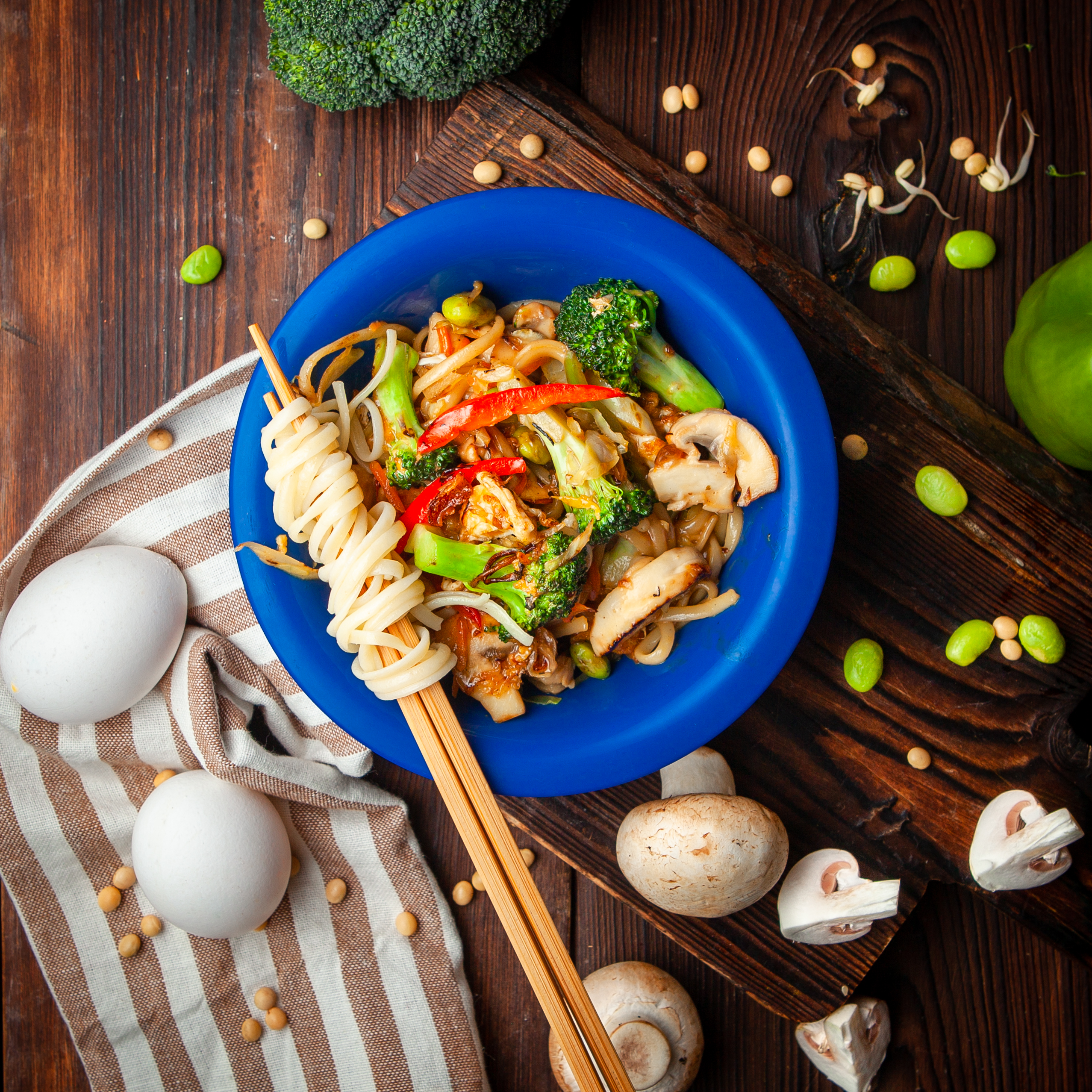 Wide rice noodle, egg, green onion and bean sprout with choice of protein
